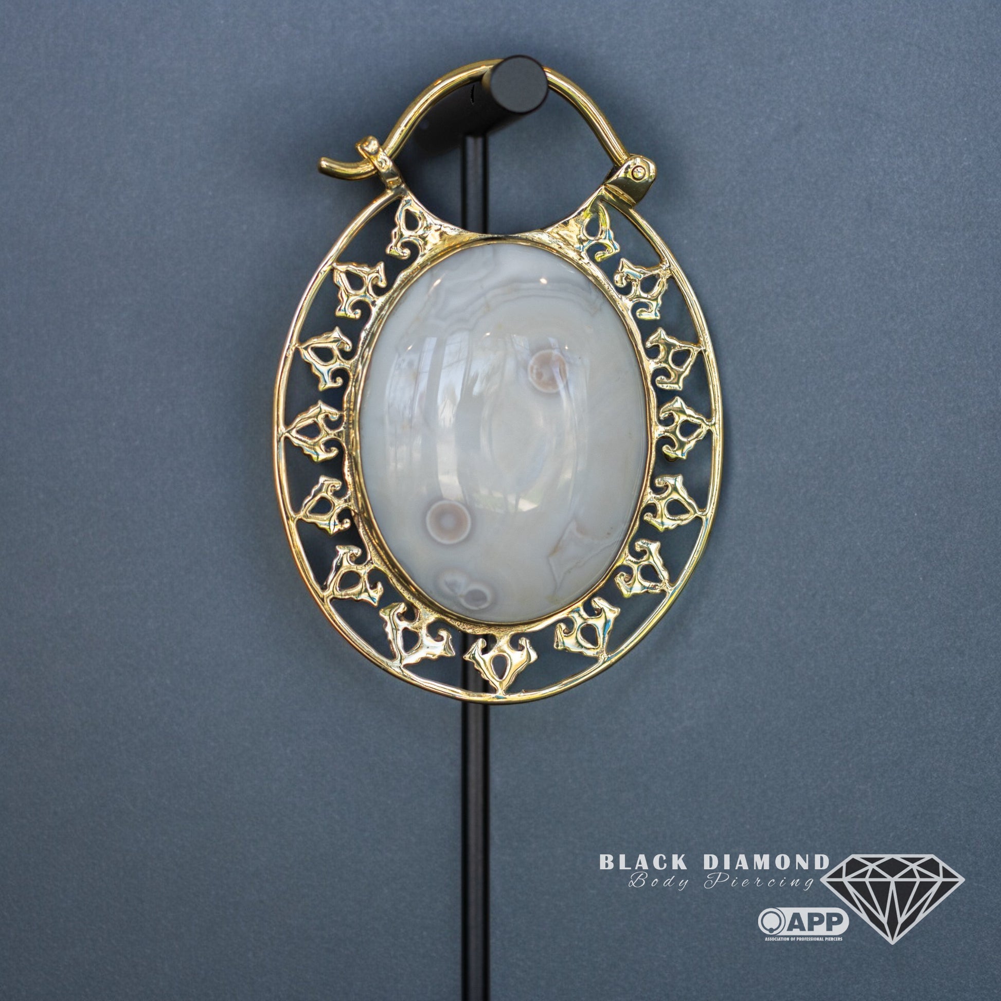 These gorgeous mini oval Isis hoops from Diablo Organics features a stunning Ocean Jasper cabochon in the center.
